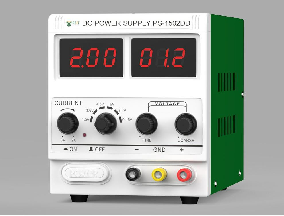 Alimentation électrique DC, modèle PS-1502DD, couramment utilisée pour la réparation d'appareils électroniques, notamment les téléphones portables et les ordinateurs portables.