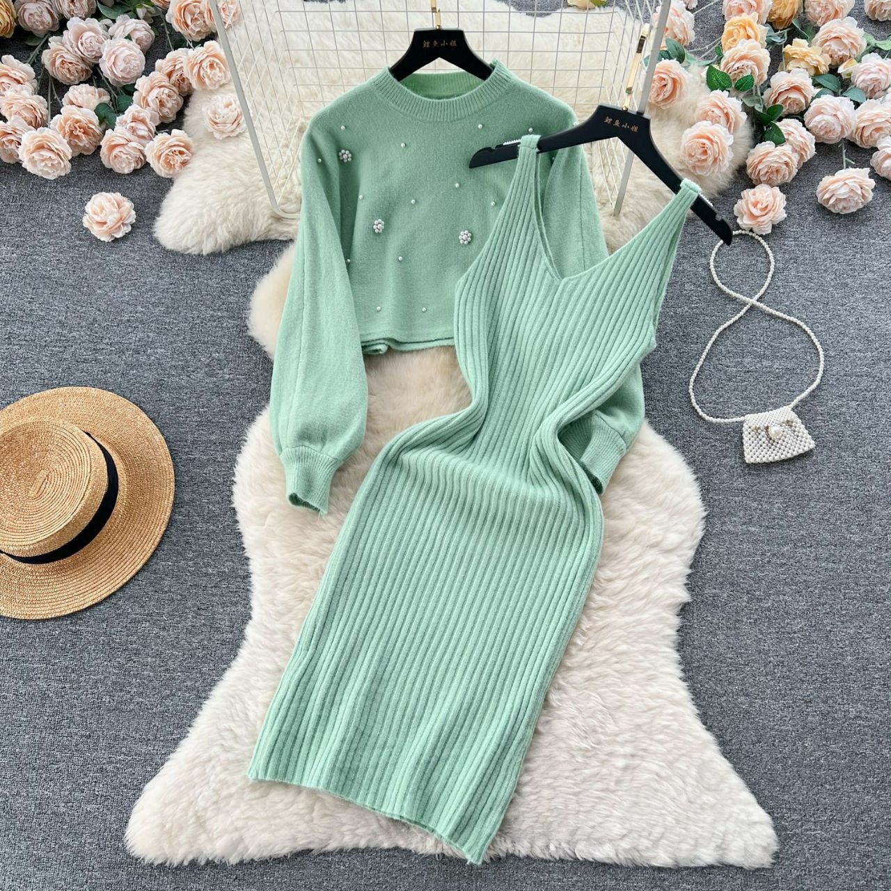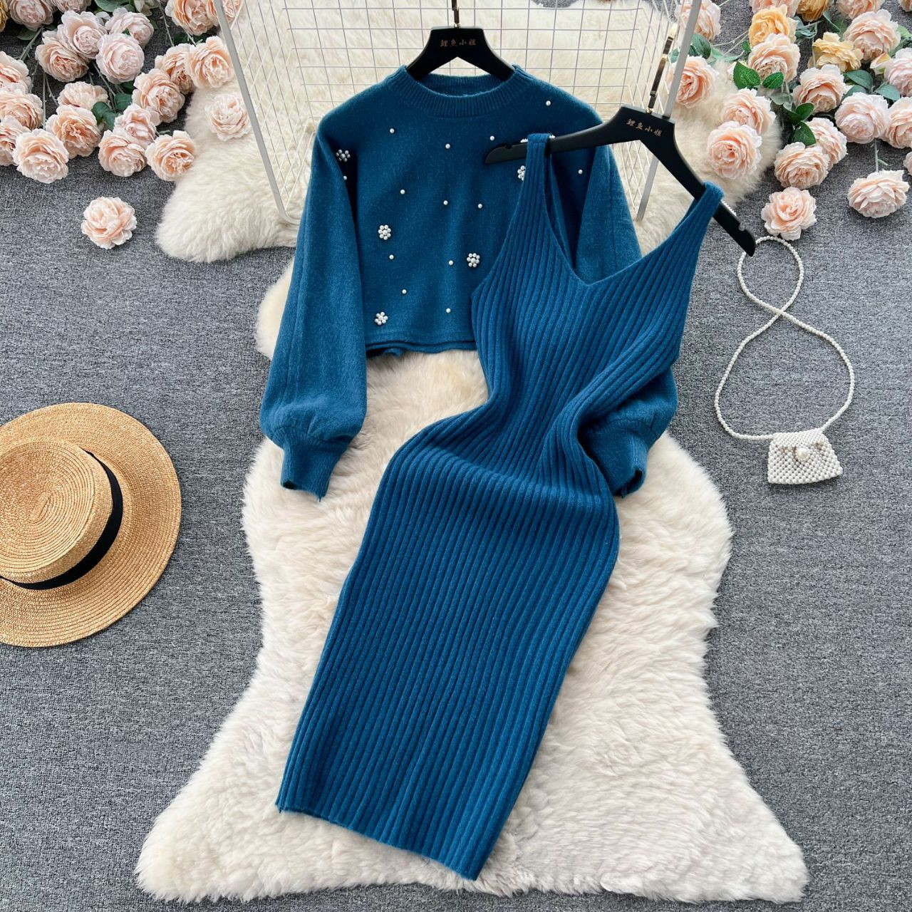 Ensemble de 2 pièces de robe Pull court à manches longues perlées à col rond, ensembles assortis , robe taille haute,