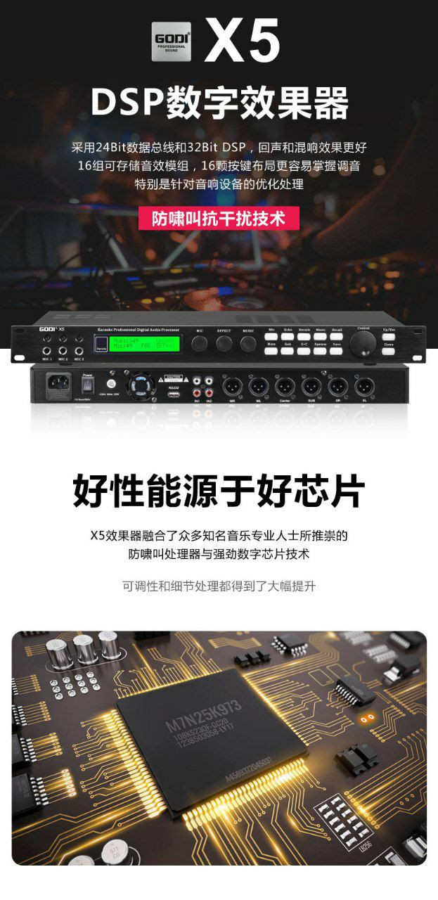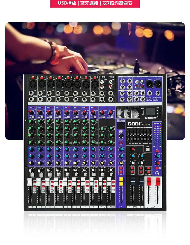 Les amplificateurs utilisent des tubes de puissance Toshiba et intègrent une protection contre les surcharges. Le microphone sans fil offre une réception à vraie diversité pour une meilleure fidélité sonore et une portée de 500 mètres en espace ouvert. La table de mixage dispose de 99 effets DSP et de fonctionnalités Bluetooth et d'enregistrement MP3.