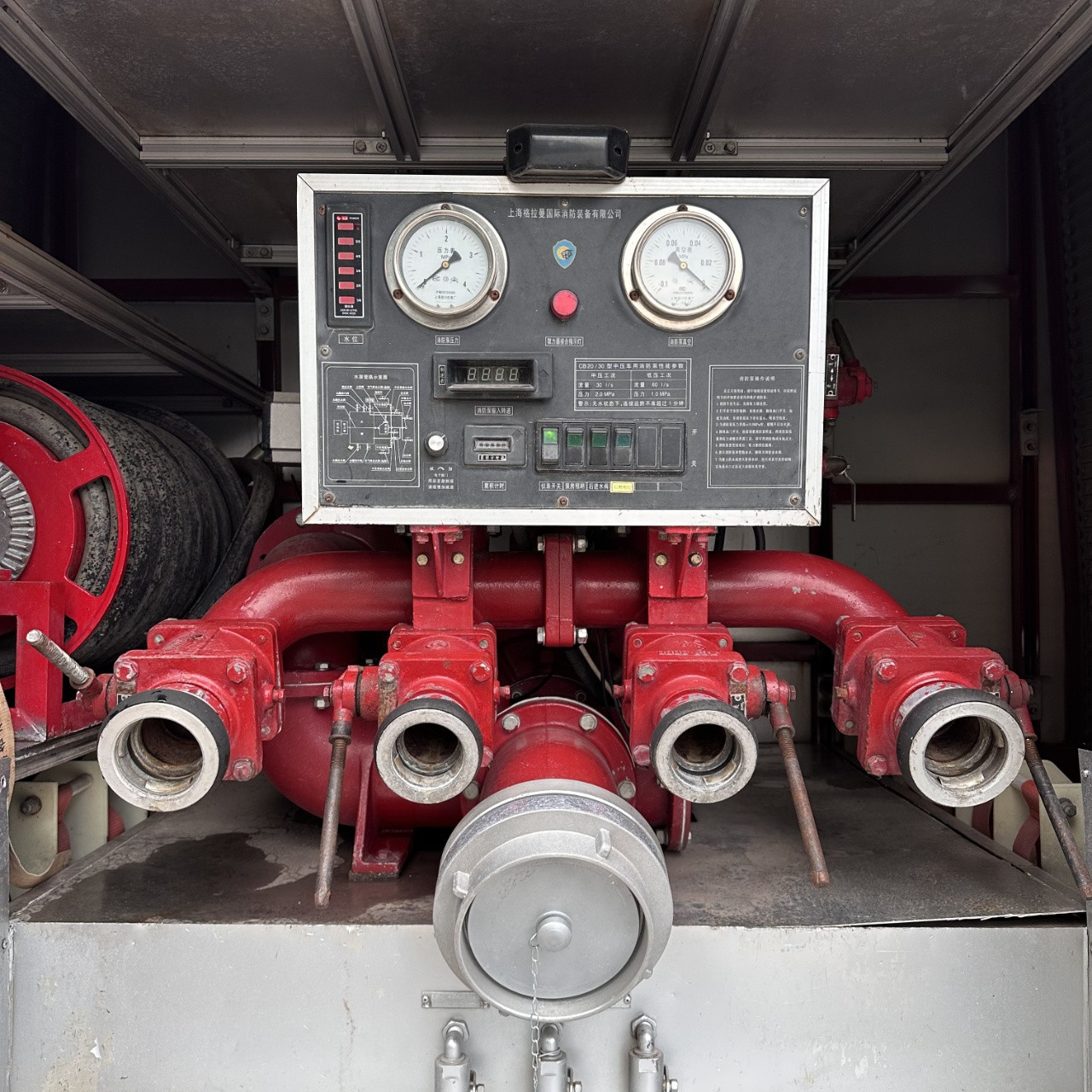 Il dispose également de deux sorties basse pression de 65 mm et de quatre sorties de 80 mm. Capable de déployer simultanément 4 tuyaux d'arrosage, avec 4 entrées d'eau de 65 mm, profondeur d'amorçage automatique ≥ 7 mètres, coffret multifonctionnel de grande capacité, pouvant être équipé de divers équipements d'extinction d'incendie et de sauvetage, utilisable pour l'alimentation en eau en zones isolées et le drainage des eaux pluviales, en parfait état neuf, convient à une utilisation dans diverses usines chimiques, centres commerciaux, sites touristiques, villages, écoles et équipes de secours, et fonctionne comme au premier jour.
